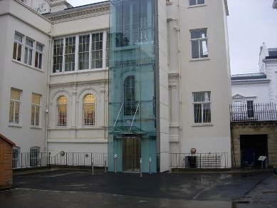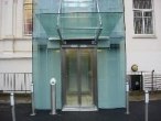 Liftline worked closely with the Architects, Engineers and Project Manager to determine a scheme for a bespoke external panoramic lift installation specifically designed for the Consulates electric wheelchair. The lift was designed with centre guides and the twin hydraulic rams situated at the rear so that the front of the car and the shaft could be glazed. Providing direct access from the car park to all floors of the building the glas front was etched to mimic the original fasade of this listed building.